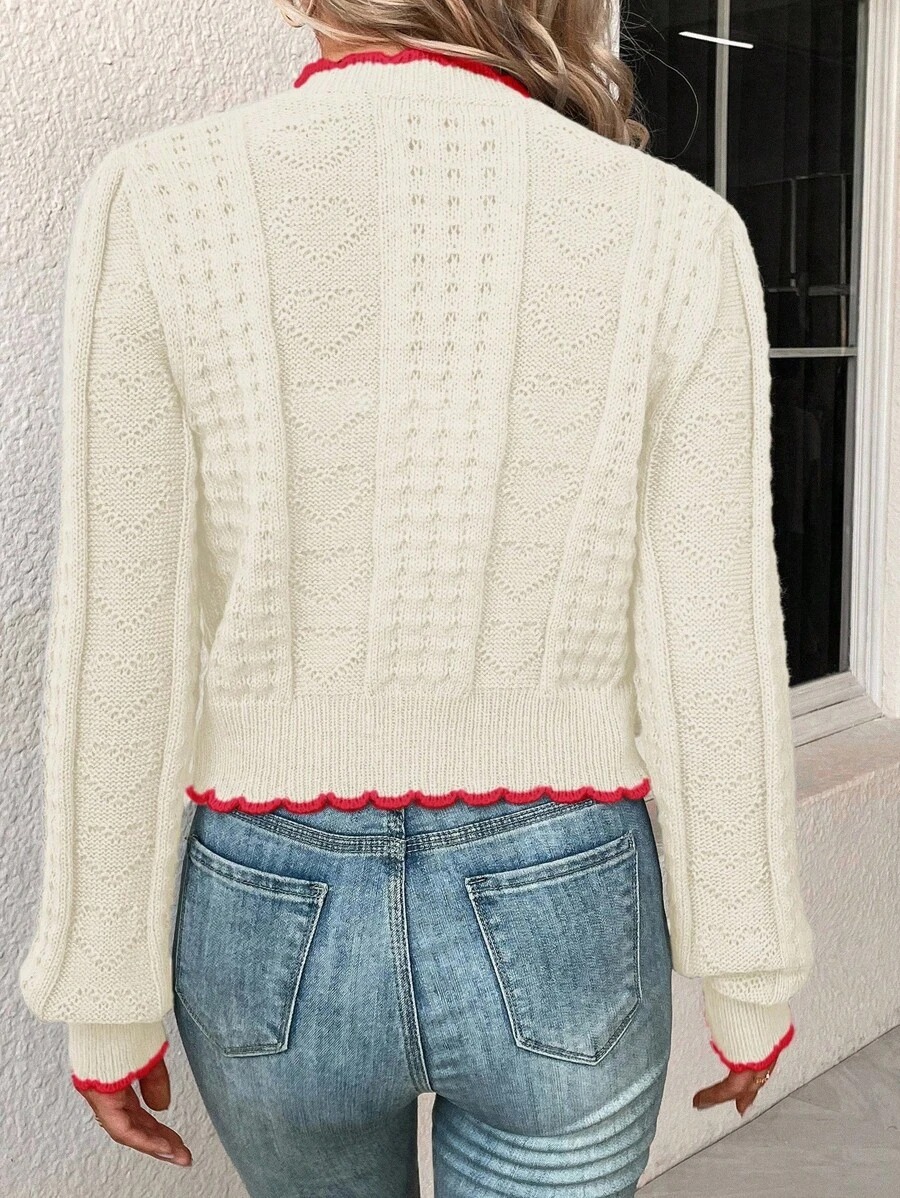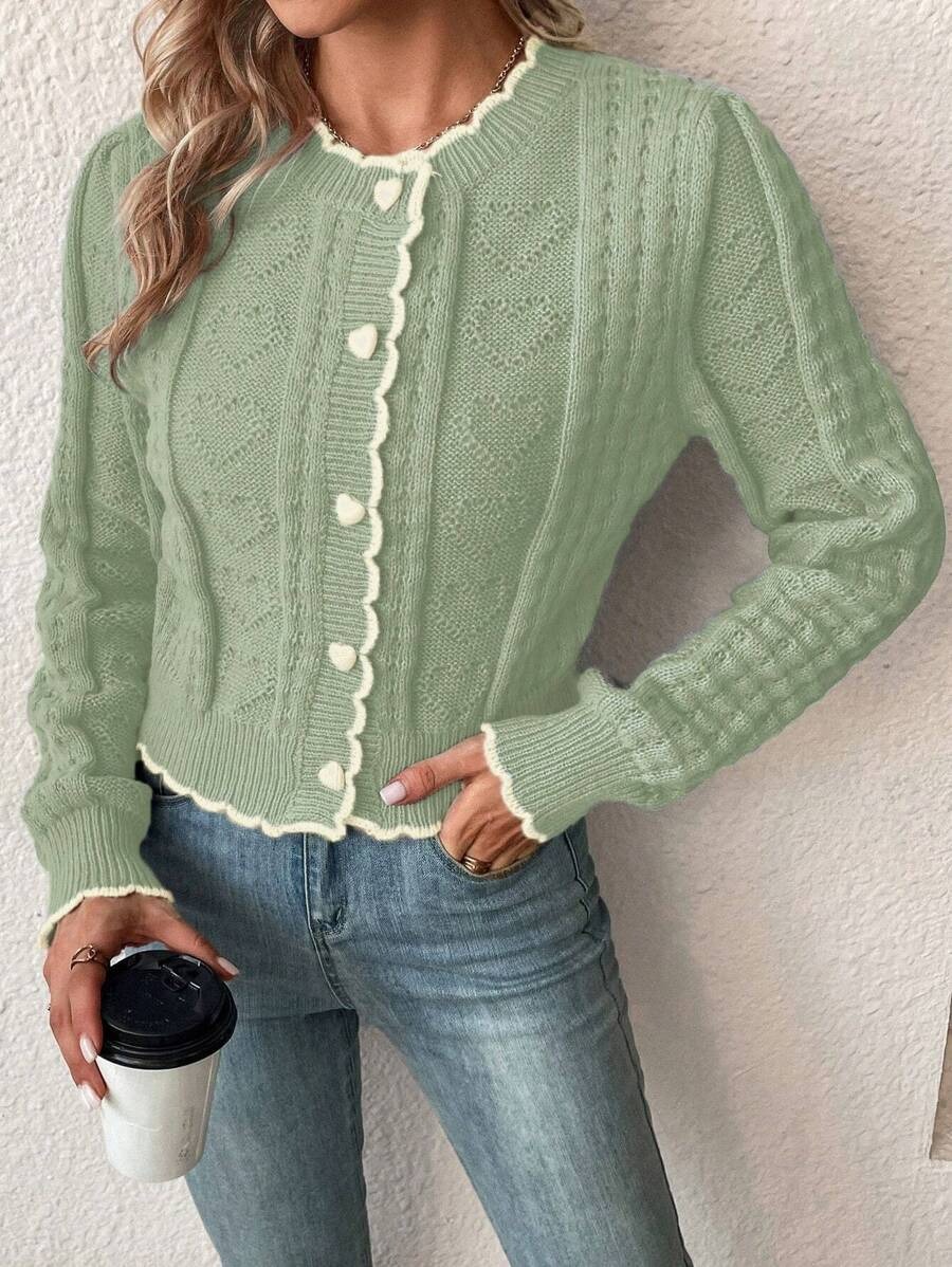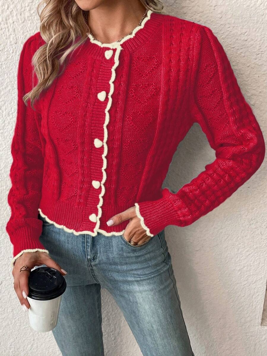 Elegant Contrast Color Lace Heart-shaped Button Knitted Cardigan Coat